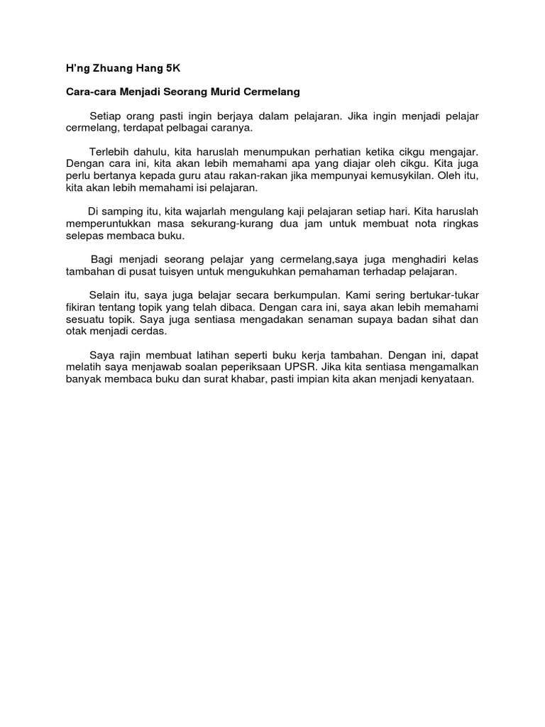 Cara-cara menjadi murid yang cemerlangSesuai untuk murid tahap 2 iaitu tahun 4 hingga tahun. Contoh Karangan Syarahan PT3. Belajar berkumpulan juga salah satu cara untuk menjadi murid yang.